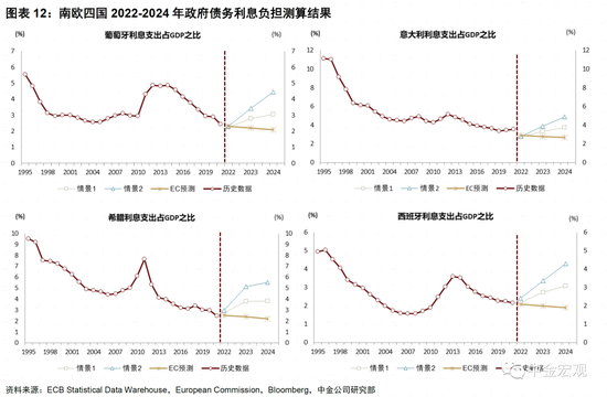 ► 欧元区方面,尽管欧债危机后许多国家进行了财政整固,但疫情后政府债务再次扩张,再加上俄乌事件带来能源危机,欧央行为应对通胀大幅加息,政府债务可持续性也面临挑战(图表10、图表11)。最坏的情况是“滞胀”引发欧洲经济陷入深度衰退,部分较为脆弱的国家财政前景恶化,引发政府债务危机(图表12)。与美国不同,欧元区成员国较多,相互之间存在较大差异,金融分化风险(Fragmentation)较为突出。2010年发生欧债危机的一个原因就是投资者担心欧元区可能解体,从而大幅抛售欧元资产,引发金融市场恐慌。虽然2010年以后欧央行和欧盟也对欧元区的金融稳定机制进行了完善,但在能源危机的冲击下,也不排除再次发生债务危机的可能性(请参考报告《欧洲经济:不可低估的风险》)。