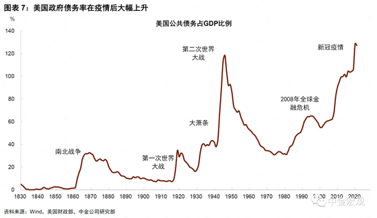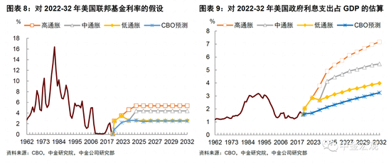 ► 除英国以外,后疫情时代其它国家也面临类似的问题。美国方面,为应对新冠疫情,美国政府也采取了大力度的财政扩张,公共部门总债务占GDP比例已超过100%,为第二次世界大战以来最高水平(图表7)。对此,我们在报告《美国偿债压力或超预期》中曾进行估算,由于通胀和利率上升,美国政府“借新还旧”的压力将不断上升。我们的结果显示,在低增长、高通胀、高利率的极端情形下,美国政府利息支出占GDP比例或将从2022年的2%上升至2032年的7%,远超此前美国国会预算办公室(CBO)此前所预计的3.3%(图表8、图表9)。不可否认,美元拥有全球储备货币地位,美国政府违约风险比一般国家小,但在通胀高企、央行加息、地缘冲突加剧、逆全球化的大背景下,也不能忽视这方面风险。