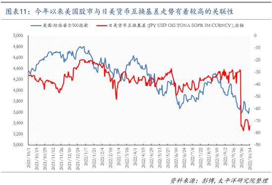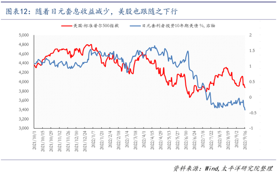 实际利率上行,流动性阶段性承压,全球股市仍将面临估值压力。如上文所述,当日元套息收益为零,美债抛售压力加大,这将对估值产生挤压。而此次日元套息收益大幅收窄来自于美国短端利率大幅上行,美元的融资成本和对冲汇率的成本增加,这也使得美股与日美货币互换基差的走势关联度较高,反应了美元流动性收益对资产估值的压力。