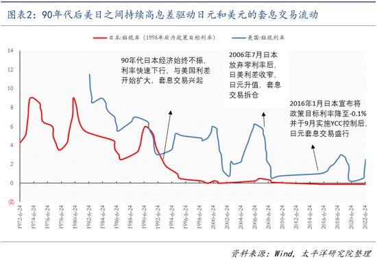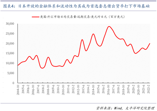 90年代后日本持续的低利率使得日元成为国际套息交易(carry trade)的首选借出货币。套息交易指的是将低息货币换成高息货币,再扣除外汇锁定成本后取得比持有低息货币更高收益的交易。90年代后日本的持续低利率与美国、澳洲等国家形成持续高息差,同时日本作为金融资本开放、经济实力出口贸易强劲的发达经济体,日元在全球金融市场有着较高的流动性。低利率和高流动性共同奠定了日元成为国际套息交易中的首选。