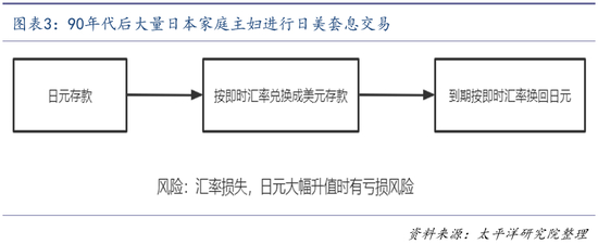 日元作为国际货币市场中流通性较好的货币加上日本自身金融体系的完善使得低利率的日元成为全球套息交易中最好的负债货币。一方面日本完善开放国际化的金融体系使得日元对美元等主要经济体货币远期互换交易流通性极好,为套息所需的锁汇流程提供了足够的市场空间。大部分国家货币即使利差很高也不具备如此条件,如人民币和阿根廷的比索虽然国家内部利差足够大,但是由于在国际货币市场中流通性较差,并不具备远期汇率锁定的条件,使得套息交易无法进行。另一方面日本是主要发达经济体中结构性问题最严重,需求最为疲软,利率长期最低的国家,日元长期以来一直是借出成本最低的货币。20世纪90年代起,日本利率大幅下降至0%附近徘徊,而同时期的美国利率却在5%左右,高额的息差吸引了大量日本的家庭主妇们的投资兴趣,开始了早期的日元套利交易以赚取息差。由于“渡边”是日本常见的姓氏,这些通过套息交易获取大量利润的日本家庭主妇也被称为“渡边太太”。但是由于这些交易较少锁定汇率,因此一旦日元发生大幅升值,这些交易也将在套息结束换回日元时面临亏损。对于日本家庭的套息交易而言,其负债端成本相当于日本的存款利率,资产端收益相当于美国的存款利率,而风险则来自于汇率的变动。日本家庭的套息交易流程如下: