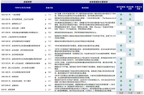 衰退的结束意味着增长的修复、需求的回暖、以及失业率的回落。我们发现经济走出衰退的关键因素有三,即货币政策的宽松、政府财政支出的发力以及外部冲击的消退(例如1973年第一次石油危机结束依靠石油供给冲击的逐渐缓和、1990年初代危机的结束得益于解放科威特后外部冲击的消退)。1920年以来的18次衰退结束的主要原因中:货币政策放宽总计13次、财政政策放宽11次、外部冲击消退3次。