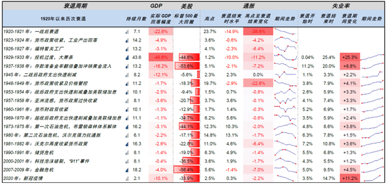 图表:20年代以来历次衰退前后通胀及失业率情况一览
