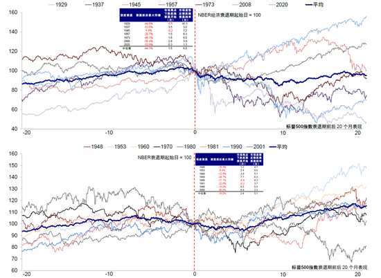 1)整体表现:深度衰退开始前后,美股标普500最大回撤中值44%,远大于轻度衰退19%的最大回撤。
