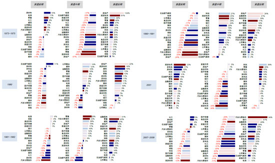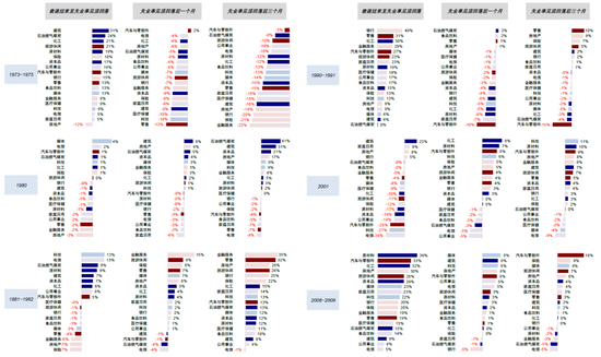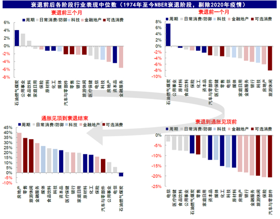 图表:衰退前后(叠加通胀拐点)美股行业表现一览