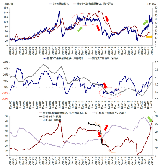 1)居民和金融部门自金融危机后持续去杠杆,现在均相对健康,居民部门目前依然有较多的超额储蓄。2)在美元储备货币体系下,政府部门的融资压力并不是我们需要过多担心的短期约束。3)企业部门的杠杆水平并不算低,但内部存在分化,依赖低息融资的高收益债可能面临更大压力(当前10年期高收益债券信用利差已升568bp,加上长端国债后的融资成本已升至扣除疫情后的2016年以来新高)。不过,由于企业并没有开启资本开支周期(《资本开支周期走到哪了?海外资产配置之投资周期(3)》),因此当需求下滑时,企业更多是面临影响利润的主动去库存、而非类似于2014年页岩油企业在油价大跌时面临的去产能和去杠杆(《美国主动去库存的资产含义》、《从库存和产能周期看美国衰退与盈利压力》)。在这一背景下,需求和利润的放缓是大概率事件,但更多是利润表和现金流量表层面的影响,而并非资产负债表层面的压力。