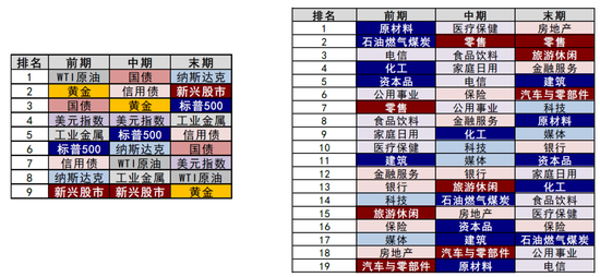 资产及行业的打分排序上,1)计算前中后期资产及行业表现;2)将资产及行业表现由高到低进行排序;3)将历次衰退资产及行业表现的排序结果取平均;4)将平均后结果进行打分。