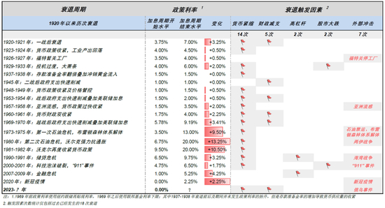 举例而言,上世纪70~80年代更多是供给冲击下美联储应对高通胀快速加息所致;1929年经济大萧条及2000年科技泡沫破裂更多是大量投机和过高估值推升美股触发金融系统性风险所致;1920年、1945年、1953年、1969年更多是由战后政府财政支出大幅削减所致。总结来看,18次衰退中:货币紧缩14次、财政减支5次、高杠杆2次、股市大跌2次、外部冲击7次。