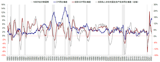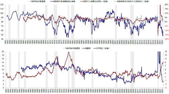 图表:经济衰退通常抑制居民消费,且高通胀下货币政策过快收紧使得对消费的抑制相较衰退开启具有领先效果