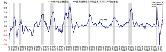 基于这一理论,我们采用美国实际GDP增速(近似代替自然利率)与投资级债券实际收益率(近似代替市场利率)对比来拟合历史上的不同状态。回测显示,过去十几年间,当这一差距(投资级债券实际收益率 – 实际GDP同比)突破某一阈值后(250bp左右),往往对经济衰退风险有较高的预示意义,股市也相应会出现较大回撤。截至9月末,这一差距为205bp左右,我们测算可能于10月末后衰退压力或达到阈值。