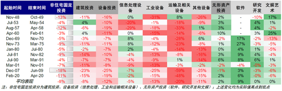 我们以实际GDP私人部门非住宅固定资产投资来刻画企业投资行为,并从整体和内部结构上两个方面对投资进行分析。私人部门非住宅固定资产投资由建筑、设备和无形资产投资三项构成。通过对比1960年以来历次衰退经验中投资绝对规模和同比增速变化(早期数据由于波动较大,可参考性不强),我们发现: