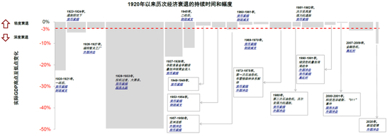 不同衰退对经济的冲击程度不同。20年代以来,美国总计经历了18次衰退,持续时间中值10.6个月,其中最长的是1929年~1933年的经济大萧条(~44个月),最短的是2020年新冠疫情爆发(~2个月)。