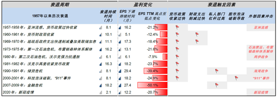 图表:历次衰退触发因素包括货币紧缩、财政减支、高杠杆、股市大跌以及外部冲击