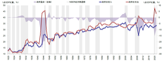 ► 财政政策上,衰退期间政府财政压力加大,往往伴随着支出上升、收入下降。衰退期间,美国政府在通过发放失业救助等社会福利支出的方式帮助经济实现复苏的同时,也积极推行减税政策以刺激经济。因此衰退期间政府支出上升而收入下降的“两股力量”使得整体财政压力加大。