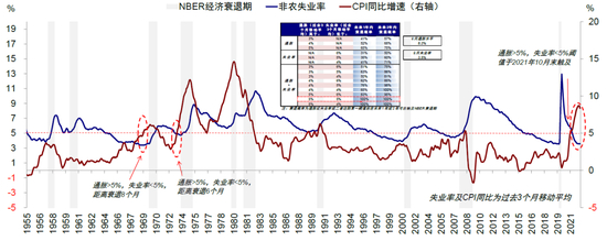 图表:回溯看,当通胀大于5%而失业率低于5%时,未来1~2年出现衰退的概率为100%