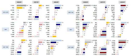 ► 1990年~1991年(货币紧缩+高杠杆+外部冲击):监管放松刺激投机行为,货币政策收紧加剧储贷危机;海湾战争引发供给冲击再度推高通胀。