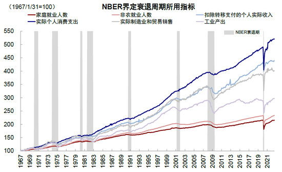 图表:NBER定义衰退主要考察的指标包括扣除转移支付后的个人实际收入、非农就业等6个指标