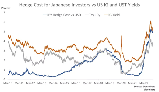 美国短期利率相对于长期利率的快速上升,以及现在美国利率曲线的反转,使得日本投资者在短期内借入美元(包括通过掉期市场)并购买安全的美国政府债券是无利可图的。