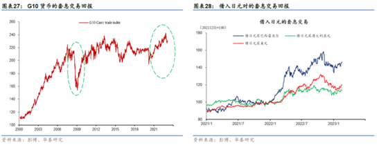 套息交易(carry trade)反转可能加剧市场波动。套利交易是指借入低息货币,然后存入高息货币,在汇率变动不大时,投资者从中可以获得利差收入。2008年全球金融危机前,借入日元买入其他高收益货币的套利交易盛行一时,导致日元大幅贬值,也加剧了全球资产泡沫的膨胀。但是全球金融危机的爆发,风险偏好下降,国际投资者买入日元,日元明显升值,套利交易反转,收益大幅回落,并加剧了资产泡沫的破灭。例如G10货币之间的套利交易(借入低利率的三个货币,买入高利率的三个货币。)最大回撤达到32%(图表27)。2021年各主要发达国家开始加息抗通胀,而日央行坚持YCC,日元与其他货币的利差扩大,借入日元的套利交易再度流行,具体的规模尚难以估计。但是从借入日元买入巴西、美国和澳大利亚货币的套息交易回报来看,2022年以来套息交易规模仍在增加,22年起截至2023年2月16日的回报分别达到46%、21%和14%(图表28)。