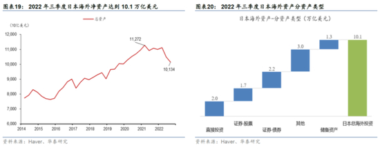 2013年QQE后,日本海外资产上升2.4万亿至10.1万亿美元。2013年日本实施超宽松货币政策(QQE)以来,日本持有海外资产规模从2014年一季度的7.7万亿美元增加至2022年一季度的11.3万亿美元,此后回落至2022年三季度的10.1万亿美元(图表19)。分部门来看,包括寿险公司、养老金等非银金融机构是日本海外资产的最大持有人,2022年3季度规模达到4.0万亿美元,例如日本政府养老金投资基金(Government Pension Investment Fund,GPIF)是全球最大的养老金,2022年3季度持有的海外债券和股票规模合计0.66万亿美元;银行持有海外资产2.1万亿美元,政府和央行持有1.6万亿美元,其中大部分均为储备资产(1.3万亿)。从资产类别来看,2022年3季度,直接投资为2万亿美元,证券投资3.9万亿美元(债券2.2万亿美元,股票1.7万亿美元),其他投资3万亿美元,储备资产1.3万亿美元(图表20)。由于直接投资更多受两国长期经济前景的影响,对利率变动不够敏感,我们更多关注证券投资,特别是海外债券投资对日债收益率上升的反应。