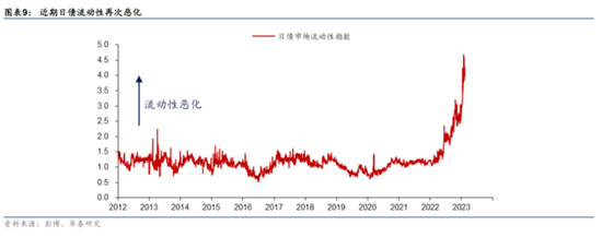 从国债市场技术层面来看,坚持YCC已严重影响日本国债市场价格发现和融资功能。全球利率中枢走高的背景下,YCC压低日本国债收益率,将10年日本国债价格推升至“合理估值”之上,扭曲了国债曲线形状,日本国债市场的价格发现功能受到严重影响(图表7)。国债收益率曲线作为经济整体的无风险利率曲线,长期被扭曲可能会导致资源错配,不利于发挥正常的资源配置功能。价格虚高“挤出”国际投资者,日本国债市场流动性显著下降。为捍卫YCC政策,2022年以来日本央行被迫加大购债规模,2023年1月月度购债规模达到23.7万亿日元,创2013年以来的最高水平(图表8)。彭博日本国债流动性指标显示,当前日本国债市场的流动性已经降低历史低位附近(图表9)。