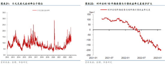 海外与日本国债利差收窄可能导致没有进行汇率对冲的投资者加快回流日本。未经过汇率对冲的债券投资,即投资者将日元兑换成外币,然后投资于海外债券,投资收益受到汇率和风险溢价影响。以美债为例,投资者投资美债的超额收益=10年期美债收益-汇兑损失-10年期日债收益率。由于日元波动率和风险溢价位于高位(图表21),未对冲汇率风险的投资者的海外投资需要较大的风险补偿。2022年12月20日日央行上调YCC波动区间至0.5%对全球国债市场的影响相对有限,并未观察到大规模回流。我们认为,这可能是由于海外与日本的收益率之差可能仍能够补偿日本投资者面临的风险,例如10年期法债收益率较10年期日债收益率仍然高240个基点。但是当日债收益率升至1%以上时,虽然海外国债收益率大概率仍然高于日本,但两者之间的利差已经进一步收窄,可能无法补偿投资者所面临的风险,从而引发日本海外投资加快“回流”。