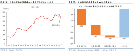 对美债市场的中期影响有限。其他G10国债如出现明显回撤,比价效应可能推动美债价格回落。然而,直接影响层面,日本投资者海外债券投资经过汇率对冲,且已经大量减持,故对美债市场的中期影响有限。日本寿险公司海外债券投资的平均对冲比率为70%,由于对冲后的美债吸引力持续下降,银行、寿险公司和养老金等日本投资者在2022年已经持续减持美债。截至2022年11月日本持有的美国国债存量相对2021年11月高点的1.33万亿美元下降至2022年12月的1.08万亿美元,降幅接近五分之一,占美债存量比例也从2021年9月的5.9%下降至2022年10月4.6%(图表25)。即使剔除了估值波动的影响,日本投资者的主动卖出也达到44%(图表26)。此外,官方储备持有的美国债券不会因为日债收益率上升而减持,限制了债券回流的规模。