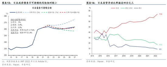 短期内,增长、通胀和政府收入上升有望抵消付息成本压力。2016年以来,日本国债收益率维持在0附近,拉低日本政府的债务成本。根据IMF的测算,2021年政府债务的平均利率为0.62%,利息支出仅为GDP的1.6%(图表11),显著低于美国(2.5%)。国债收益率提升预计在未来将逐步推高日本政府债务成本,但是由于日本政府债务平均期限为8年,国债收益率上升短期只影响新增债务的融资成本,因此对政府平均债务成本的直接传导有限。例如,根据IMF的测算,日本国债收益率上升200个基点,4年后平均债务成本仅上升80个基点。增长、通胀和政府收入上升有望抵消付息成本压力。通胀上升阶段,名义GDP增速回升,而财政收入增速通常上升更多(图表12),抵消付息成本压力,政府偿债现金流压力下降。参考IMF(2022)对日本债务可持续的分析,我们的测算显示,如果通胀水平上升1个百分点,则能够完全抵消国债收益率上升2个百分点的影响,使日本的债务占比不发散(图表13)。即使日本10年期国债收益率上升至1%,由于通胀回升,短期政府债务不可持续的风险相对小。