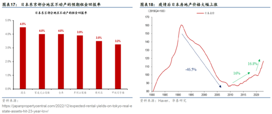 短期内,租金和通胀均上涨,虽然房贷利率上升,真实房贷利率上行幅度有限,房价调整压力不大。短期内,由于通胀较高,真实房贷利率上行幅度有限,房价调整压力不大。由于房价没有长期上涨的预期,实际租金回报率是房价的最主要决定因素,当租金回报率高于实际贷款利率时,房价将上涨,否则房价将面临调整压力。当前日本东京各类型房地产的预期租金回报率位于4%左右(图表17),仍然位于较高水平。而疫情以来通胀回升超过2个百分点,即使房贷利率上升,真实利率上行的幅度也很有限,房价调整压力不大。此外,房贷利率上升对居民的还款负担影响也有限,如果房贷利率上行50bp,预计增加幅度不到22年GDP的0.2%。从存量房贷来看,截至2022年四季度,银行等金融机构发放的房贷余额为143万亿日元,占2022名义GDP的26%。若房贷利率上升50个基点,居民利息支出上升幅度为GDP的0.12%左右。其中,浮动利率占四分之三左右,房贷利率上调50个基点,利息支出增加0.53万亿日元,占居民可支配收入0.2%,占2022年GDP 0.1%;非浮动利率占比为四分之一左右,由于国债利率向存量房贷传导较慢,即使2023年传导幅度达到一半,房贷利息支出仅增加0.09万亿日元,占居民可支配收入0.03%,占2022年GDP 0.02%。从流量房贷来看,2022年三季度新增个人住房贷款(折年数,下同)占家庭可支配收入的5.0%,占GDP的2.9%。若房贷利率上升50个基点,则新增房贷利息支出仅占家庭可支配收入的0.03%,占GDP的 0.02%。