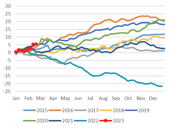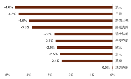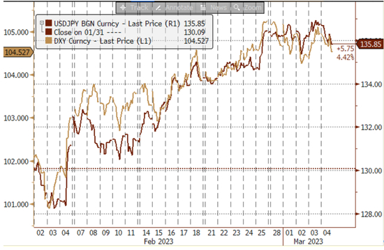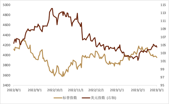 2月月内美元持续走强。美元在2月月内在美国经济数据整体走强并且带动市场对美联储加息预期上涨的助推之下持续走高,而持续紧缩预期之下市场风险偏好明显出现回落,美股在2月月内明显走弱,而这再次为美元走强提供了支撑。全月来看美元指数上涨4%左右至年内高点附近,在G10货币中领涨(图表7)。