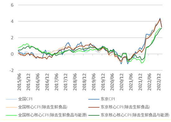 图表19:日本全国与东京地区的CPI同比走势 (%)