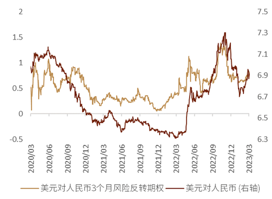 美元人民币风险逆转期权:短期内在美元上行背景下,美元人民币汇率在2月有所上行,风险反转期权也对应有所上升,但风险反转期权的水平相较去年依旧维持在低位,期权市场中对人民币贬值的定价十分有限。