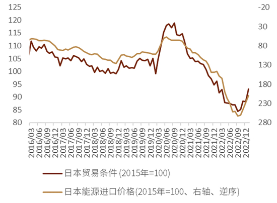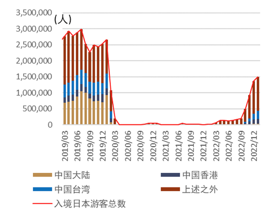 贸易账户或将改变 日本财务省公布了2023年1月日本贸易逆差为3.5万亿日元(图表20),为史上最大单月逆差。我们发现进出口两端皆有特殊原因扰动,不用过度担心日本的贸易逆差问题。出口方面,虽同比增加3.5%,但是增幅有限,受中国1月春节的影响,日本对中国出口低于去年同期。进口方面,受寒冬影响,1月能源进口数量高于往年。但我们发现能源单价仍在持续下行,伴随冬季的结束,日本的能源进口金额或有所减少,日本的贸易条件或能持续改善(图表21)。此外,服务账户也存在改善,日本国土交通省公布的1月入境日本的外国游客人数约为150万人,已迅速恢复至疫情前的近6成的水平(图表22),伴随疫情的逐步消退,我们认为今后日本的入境游客或还会保持快速恢复,进而从服务收支的层面带来一定日元升值力量。