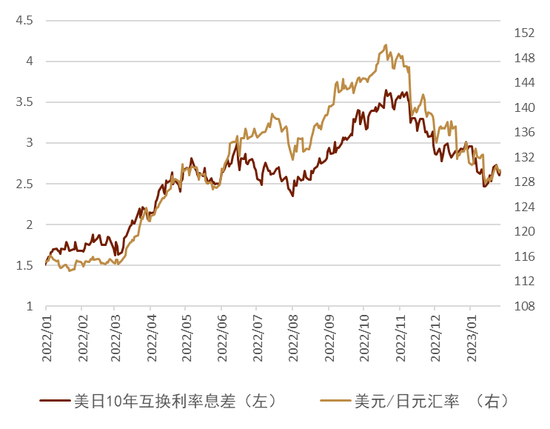 强美元+植田发言平稳=弱日元重现 2月期间,在强美元以及植田发言相对平稳的背景下2月期间日元相较美元贬值约4.50%,贬值幅度明显,日元的排名在G10与亚洲货币中都偏后。2月期间,美日汇率走势同美元指数走势相似(图表16),同时美日10年互换利率的息差也同美日汇率走势继续高度相关联(图表17)。