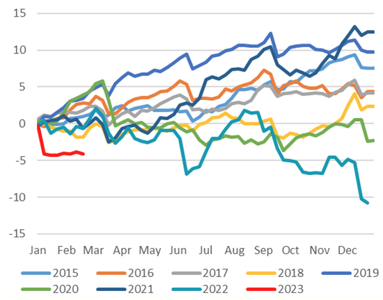 季节性因素支撑美元小幅反弹 从以往的经验看,美元在2月份的表现相对较好(过去10年中,美元有6年在3月份录得上涨,平均涨幅达到0.62%)。在欧美经济衰退的预期可能逐步加强的背景之下,美联储大概率仍会按计划进一步收紧货币政策进而使得基准利率维持在高位。在此背景之下,风险资产很难走强。我们认为避险情绪可能会支撑美元保持相对强势。