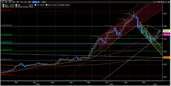 美元/日元在2月月内大幅走高,但在200天均线137.30附近遇阻有所回落。向前看,如果价格不能突破200天均线附近的关键阻力,鉴于日线级别上RSI已经出现自超买区域回落的迹象,而2月以来形成的“上升楔形”走势同样发出了看跌的警告(图27中两条白色线组成的向上收敛的三角形),我们认为价格回落的概率较大,下方第一支撑位于21天均线134附近(图27中黄色线)而55天均线132.20附近则提供下一个关键支撑。周线级别上看,21周均线136.60附近将为美元多头带来关键的阻力,除非美元多头可以成功向上突破这一关键位置,否则美元/日元回撤至55周均线133.40附近关键支撑的概率较大,而一旦美元多头失守这一关键位置,1月末以来的上升趋势则面临破位的风险。