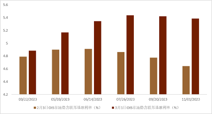 通胀压力反弹强化市场对美联储继续加息的预期。1月美国CPI数据显示通胀压力放缓势头有所减弱,1月美国CPI和PPI均超预期增长:名义CPI环比增幅0.5%为最近3个月最大,尽管同比增幅不及于前值,但市场在数据发布之后确认了美联储继续加息抵抗通胀的预期。而1月PPI环比反弹0.7%,增幅为3个月以来最大。剔除能源和其他不稳定因素后的核心PPI也上涨至去年3月以来的最高水平。而美联储青睐的通胀指标PCE数据意外加速增长,同比未能延续12月显示出的增长放缓势头,增速回升到11月的水平;而环比录得了最近五个月的最高增速;核心PCE物价指数增速也高于预期。在此背景下,美联储官员2月月内的表态同样偏向鹰派[2],而市场对美联储加息的预期在月内大幅走高,在此背景下,市场对美联储本轮加息终点利率的预期自月初的4.9%上升至5.4%附近(图表8),美债利率和美元因此获得支撑月内录得大幅上涨。