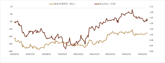 核心通胀维持在历史高位 ECB官员鹰派表态限制了欧元跌幅 受近期能源价格下跌影响,欧元区2月CPI已从历史高位出现明显回落,但核心CPI却超预期反弹。最近一周公布的2月CPI数据显示:2月CPI初值同比上涨8.5%,略低于前值的8.6%,这也是2022年5月以来的最低水平。但欧央行关注的重点,即核心CPI却在2月超预期上行,同比增速录得5.6%,超过预期和前值的5.3%,仍处于历史高位(图表13)。而这也使得一系列欧央行官员陆续发表鹰派讲话。拉加德上周表示[3],欧央行3月份需要加息50基点,必须采取一切必要措施来遏制通胀,3月之后可能会继续加息。欧央行决策者会竭尽全力让通胀回到2%。其他ECB票委如比利时行长Wunsch[4]上周也表示,如果核心通胀迟迟无法降温,市场对欧央行利率峰值会达到4%的预期可能是正确的(目前OIS市场预计ECB将在今年12月时加息至3.9%)。虽然市场对ECB的加息预期支撑了德国2年利率60基点的上行,但相较美债2年期利率更大幅的走高(75基点),德美2年利差在2月月内有所走阔,而这也使得欧元在月内走弱(图14)。