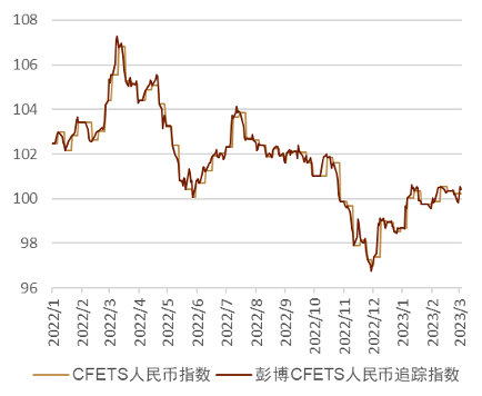 强美元背景下人民币走弱 2月期间,在美元指数升值2.7%的背景之下,人民币相较美元贬值2.6%,贬值幅度在亚洲货币居中。美元人民币汇率在2月初始于6.75,2月2日美联储会议后,人民币汇率一度涨至6.70。此后受美元反弹的影响,直至2月底美元人民币一路上行至6.90-6.95附近。整体来看,2月期间中国公布经济数据较少,人民币自身的行情不多,美元指数走势基本决定了美元人民币汇率的走向(图表2)。1月期间,人民币一篮子指数整体在100附近呈现走平趋势 (图表3)。