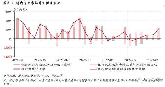 银行结售汇总顺差额大幅增加。2月份,银行即远期(含期权)结售汇(以下简称银行结售汇)顺差规模明显增加,由上月80亿美元增至214亿美元,为2022年4月以来新高。其中,银行即期结售汇由上月顺差25亿美元转为逆差19亿美元(银行自身结售汇由上月顺差19亿美元转为逆差35亿美元;代客结售汇顺差小幅扩大,由上月6亿美元升至17亿美元);未到期期权Delta敞口净结汇余额结束了此前四个月持续减少态势,环比增加25亿美元;远期净结汇累计未到期额继续增加,环比增幅由上月77亿美元大幅升至207亿美元,是银行结售汇顺差扩大的主要贡献项(见图表5)。