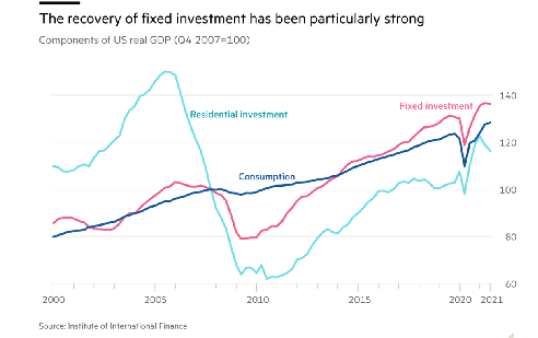 虽然美联储执行无限制扩张性货币政策的目的在于稳定股市和债市,但这一政策和美国政府2020年3月推出的扩张性财政政策大大刺激了有效需求。经过一段时滞之后,私人消费支出从2020年第四季度开始反弹(见图3),固定投资需求也沿类似轨迹恢复了增长(见图4)。简言之,在总供给曲线由于疫情冲击左移,总需求曲线因扩张性宏观经济政策右移的情况下,美国“供不应求”缺口扩大而形成的通胀压力是巨大的。