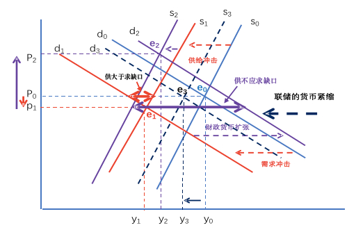 为了抑制通胀,美联储采取货币紧缩政策,总需求曲线被推向左方到达d3的位置。如果疫情消失,供应链得到修复,总供给曲线也会右移。但供给能力难以完全恢复。设总供给曲线右移到s3。对应于均衡点e3,物价回到最初的水平p0,但产出y3明显低于y0。在给定s3的情况下,若想得到高于y3的产出水平,货币紧缩度就需小一些。此时处于均衡状态的物价水平也将高于p0。换言之,为了实现较高产出水平,需要容忍物价高于原有水平。考虑到紧缩性货币政策对总供给曲线的影响,通过货币紧缩压缩“供不应求”缺口可能会变得十分困难,货币紧缩就可能导致滞胀。