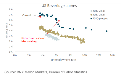 如图5所示,2002—2008年间,4%的失业率所对应的岗位空缺率小于4%(100个职位中有4个空缺),2020年之后相应的岗位空缺率高达7%以上。贝弗里奇曲线上移意味着美国失业者就业的积极性下降或难以适应企业提供的工作等。该现象应该是个结构性问题。