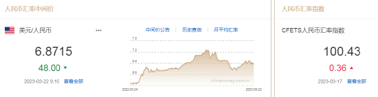 3月22日,人民币中间价报6.8715,上调48点,上一交易日中间价报6.8763,在岸人民币上一交易日收报6.8738。