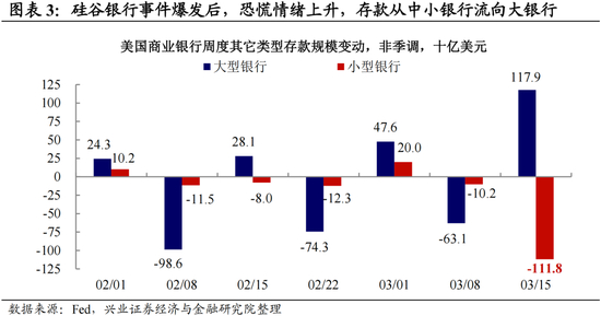 本次事件后,存款从小银行流入大银行:硅谷银行事件爆发后,出于对中小银行账面上大量“浮亏”的担忧,储户从小银行提取存款,流向大银行;