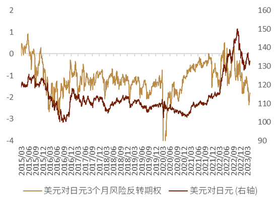 美元日元风险逆转期权:美日汇率的风险逆转期权同美日汇率方向相同。美日汇率在弱美元以及息差收窄的带动之下有所下行,同时市场对日本央行大幅调整或放弃YCC也有所担心,因而导致了美日汇率的风险逆转期权的下行。