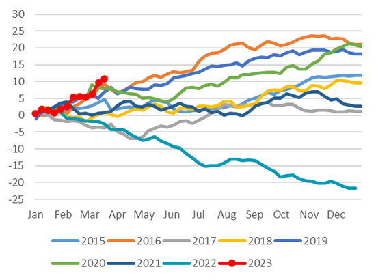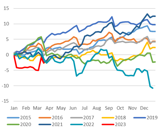 4月的关注点 4月期间中国将公布3月经济数据,去年3月期间受疫情扰动影响整体经济数据偏弱,今年3月数据或同比易偏强,进而或对人民币汇率产生积极影响。此外,往年季节性数据来看,4月期间人民币汇率并无明显的季节性特征(图表8)。美元方面,美国的金融系统风险的后续走势以及美联储的货币政策依旧是美元的决定因素。我们认为4月美元人民币汇率的中枢或在6.80附近,区间为6.65-6.95。