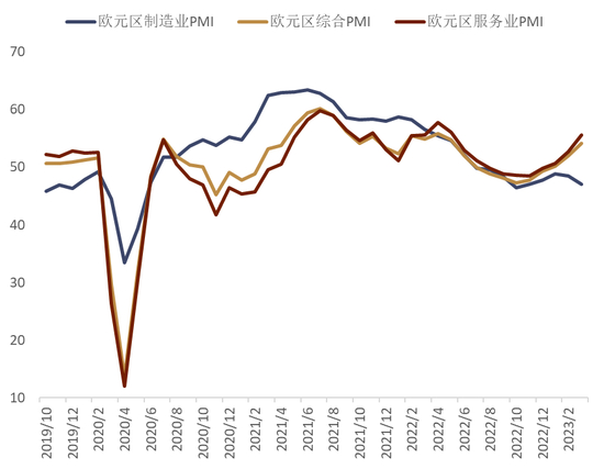 部分经济数据有所改善 但整体宏观经济数据趋弱 以PMI数据为代表的欧洲经济数据在3月再次出现分化:欧元区服务业活动继续强劲扩张,但制造业却陷入了困境。3月欧元区制造业PMI初值为仅仅录得47.1,远低于49.0的预期,这也创下了2022年10月以来最低水平。不过由于消费者继续扩大在服务业上的开支,服务业PMI从上个月的52.7上升至55.6,远高于52.5的预测,这也创下了最近10个月来的新高。综合PMI也从2月份的52.0大幅反弹至54.1,高于市场预期的51.9,同样录得了最近10个月以来的新高(图表17)。另外,德国3月ZEW数据显示企业对未来经济前景的预期自年内高点出现了回落,而在此背景下,欧洲花旗宏观经济意外指数在3月出现了小幅的下行走势(图表10)。