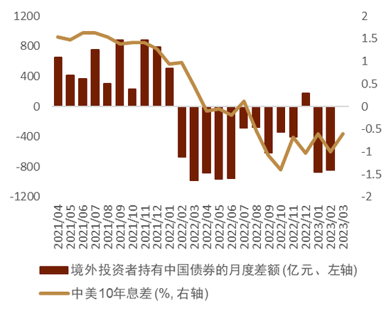 图表5:境外投资者持有中国债券的月度差额 (亿元、左轴)