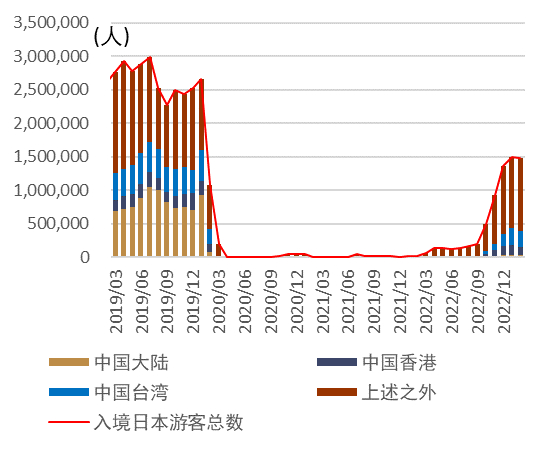 贸易账户或缓慢改善 日本财务省公布了2月贸易收支,净出口为约9000亿日元的逆差(图表27),为1979年统计开始以来的最大单月逆差。过去数月能源价格有所回落、日元也有所升值,进口金额未来或有所缩小。但自去年四季度以来,伴随主要经济体货币政策的收紧,日本的外需存在趋势性减少(图表28)。我们认为相关趋势会放缓日本贸易帐改善的速度,但是在经济逐步走向衰退的过程中,美国利率或持续下行,美日息差收窄,总体仍将利好日元。此外,服务账户方面,日本国土交通省公布的2月入境日本的外国游客人数约为147.5万人,相较上月有所减少 (图表29),我们认为减少的原因主要受季节性因素的影响,不用过度担心该数字。